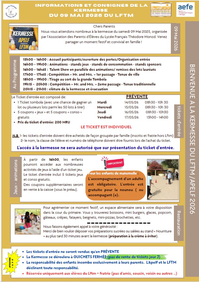 Dans le cadre de l’organisation de la Kermesse LFTM 2026, nous avons le plaisir de vous informer de l’ouverture de la vente des tickets selon les modalités suivantes :
